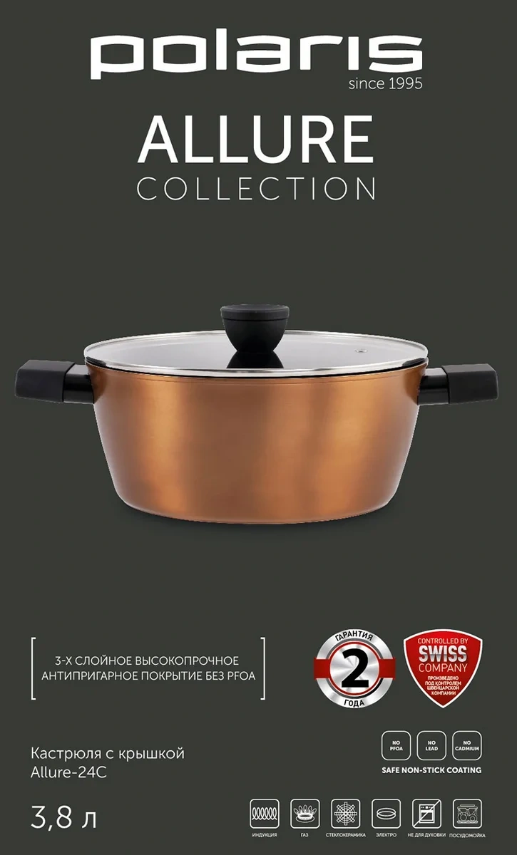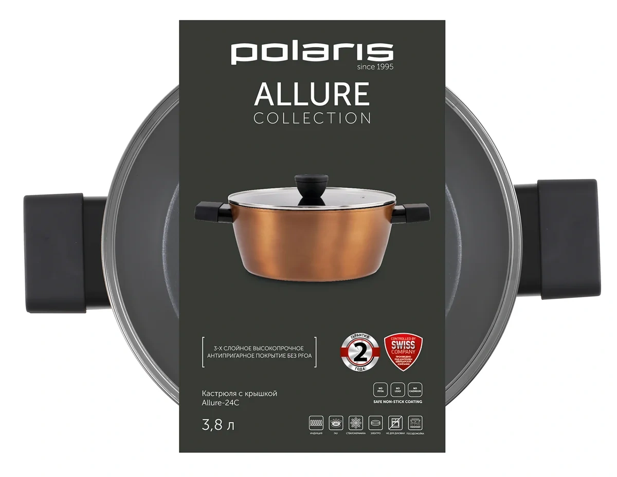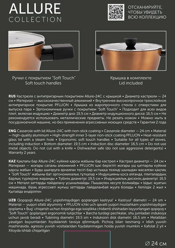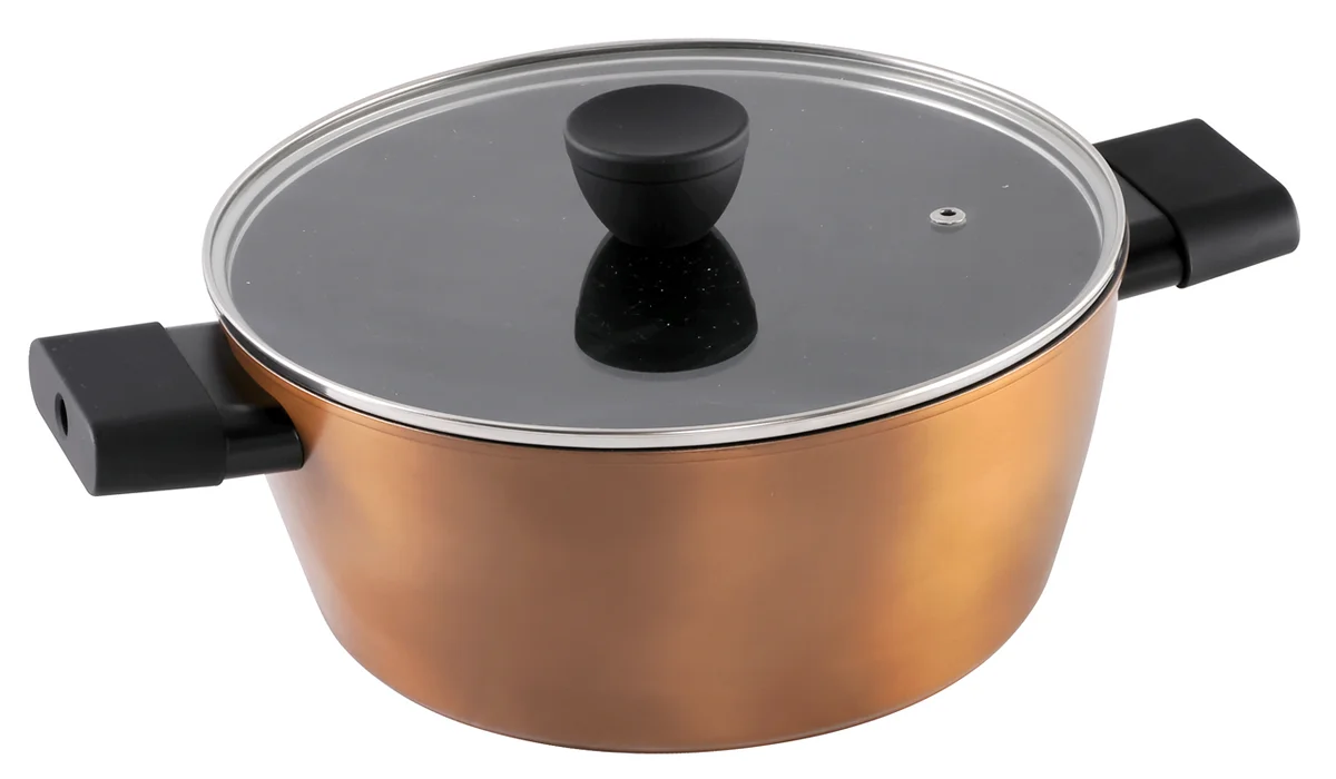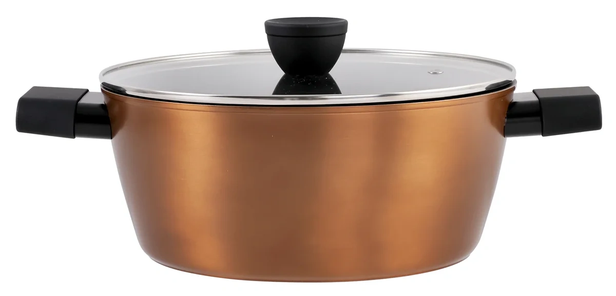 Кастрюля 24см, объем - 4,7л. Материал - кованый алюминий. Термостойкое внешнее покрытие. Ручки - эргономичные бакелитовые ручки с покрытием Soft touch. Крышка из жаропрочного стекла с отверстием для выпуска пара. Типы плит - все, включая индукцию. Гарантийный срок - 2 года. Индивидуальная упаковка - открытый картонный короб.