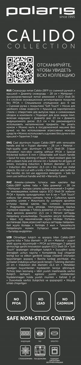 Диаметр сковороды - 28 см. Диаметр дна - 23 см. Диаметр индукционного диска - 21,5 см. Гарантия - 3 года.