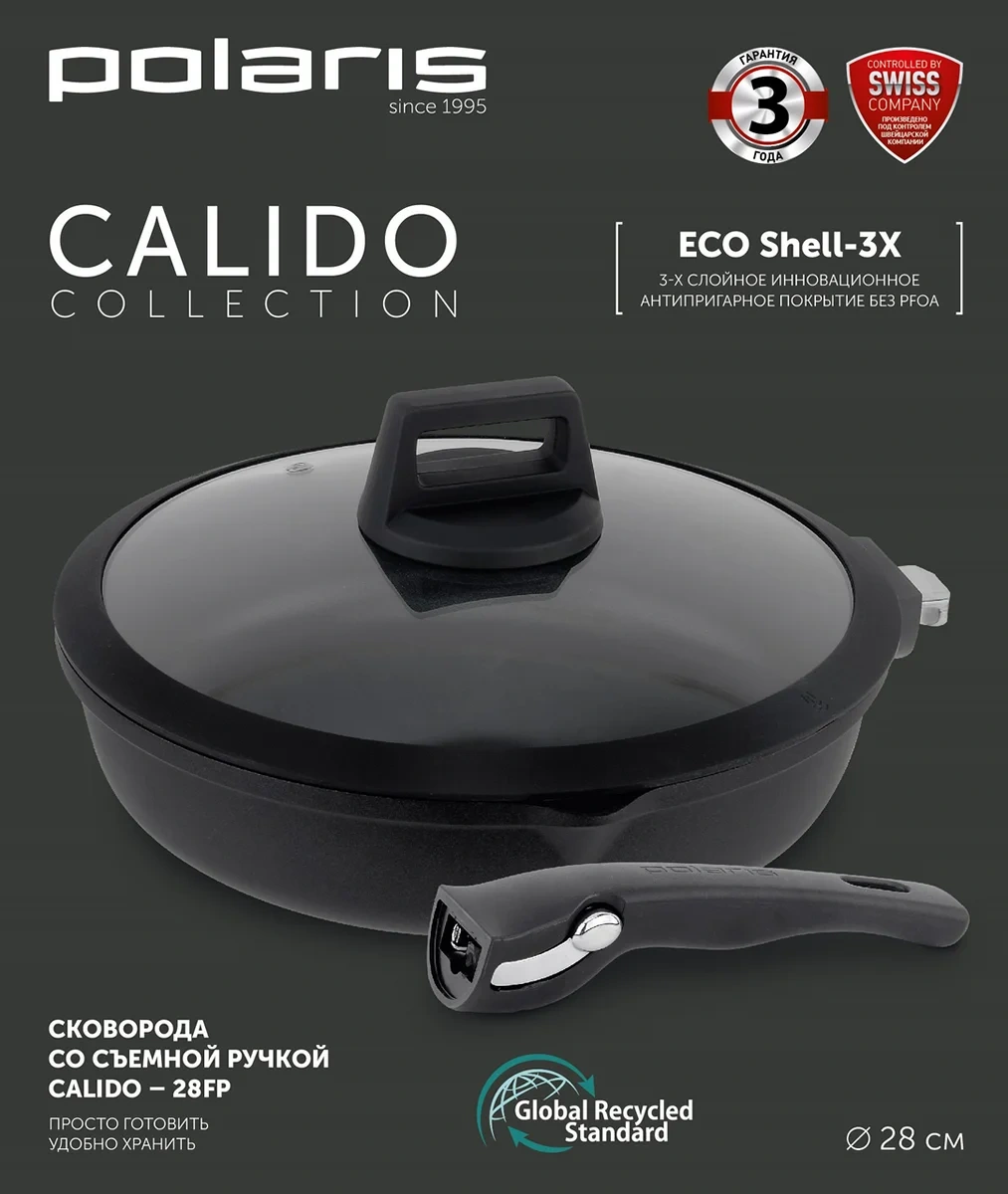 Сковорода литая Calido-28FP со съемной ручкой и крышкой. Диаметр сковороды - 28 см. Материал - высококачественный перерабатываемый литой алюминий. Подходит для всех видов плит, включая индукцию.