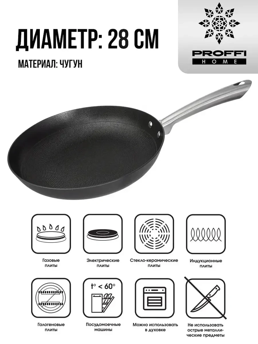 Сковорода Proffi kitchen Cast iron чугунная, 26 см обеспечивает равномерное распределение тепла и сохранение его на длительное время, что позволяет получать идеально прожаренные блюда с великолепным ароматом и текстурой. Изготовленная из чугуна, сковорода обладает высокой теплопроводностью и превосходными теплоемкими свойствами. Чугун сохраняет тепло на долгое время, что позволяет экономить энергию при готовке. Кроме того, она износостойкая и будет надежным инструментом на протяжении многих лет. Пористое строение внутренней части сковороды обеспечивает лучшую устойчивость к царапинам и более равномерное распределение масла. Уход за этой сковородой прост и удобен. Рекомендуется регулярно мыть вручную с использованием мягкой губки и моющего средства. После мытья необходимо тщательно высушить сковороду и нанести тонкий слой растительного масла на поверхность, чтобы предотвратить коррозию и сохранить ее качество. Сковорода не только обеспечивает высокое качество приготовления пищи, но и может стать стильным элементом вашей кухни. Это отличное приобретение как для использования в повседневной жизни, так и в качестве подарка близкому человеку.