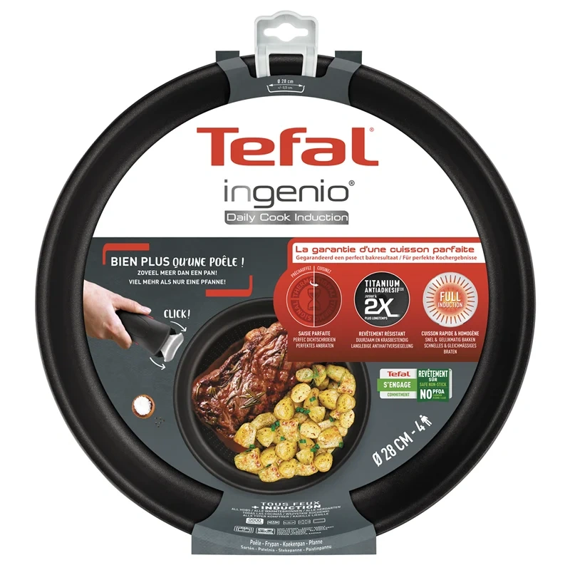 Ищете способ тратить меньше времени и сил на кухне? Серия Tefal Ingenio позаботилась о вас. Съемная ручка (продается отдельно) для легкого перемещения посуды с плиты прямо в духовку или холодильник Есть! Компактный дизайн для экономии места в кухонных шкафчиках? Сделано! Ingenio: готовить проще! Tefal представляет Ingenio Daily Cook - посуду из высококачественной нержавеющей стали с безопасным антипригарным покрытием Titanium non-stick 2X. В этих исключительно прочных и долговечных сковородах, ковшах и сотейниках блюда получаются равномерно приготовленными и особенно вкусными и ароматными. Посуда Ingenio не подходит для хранения кислых продуктов. Благодаря титановым частицам поверхности, покрытие сохраняет отличные антипригарные свойства до 2-х раз дольше по сравнению с стандартным покрытием Tefal Titanium. Посуда подходит для использования на газовых, электрических, стеклокерамических и индукционных плитах.