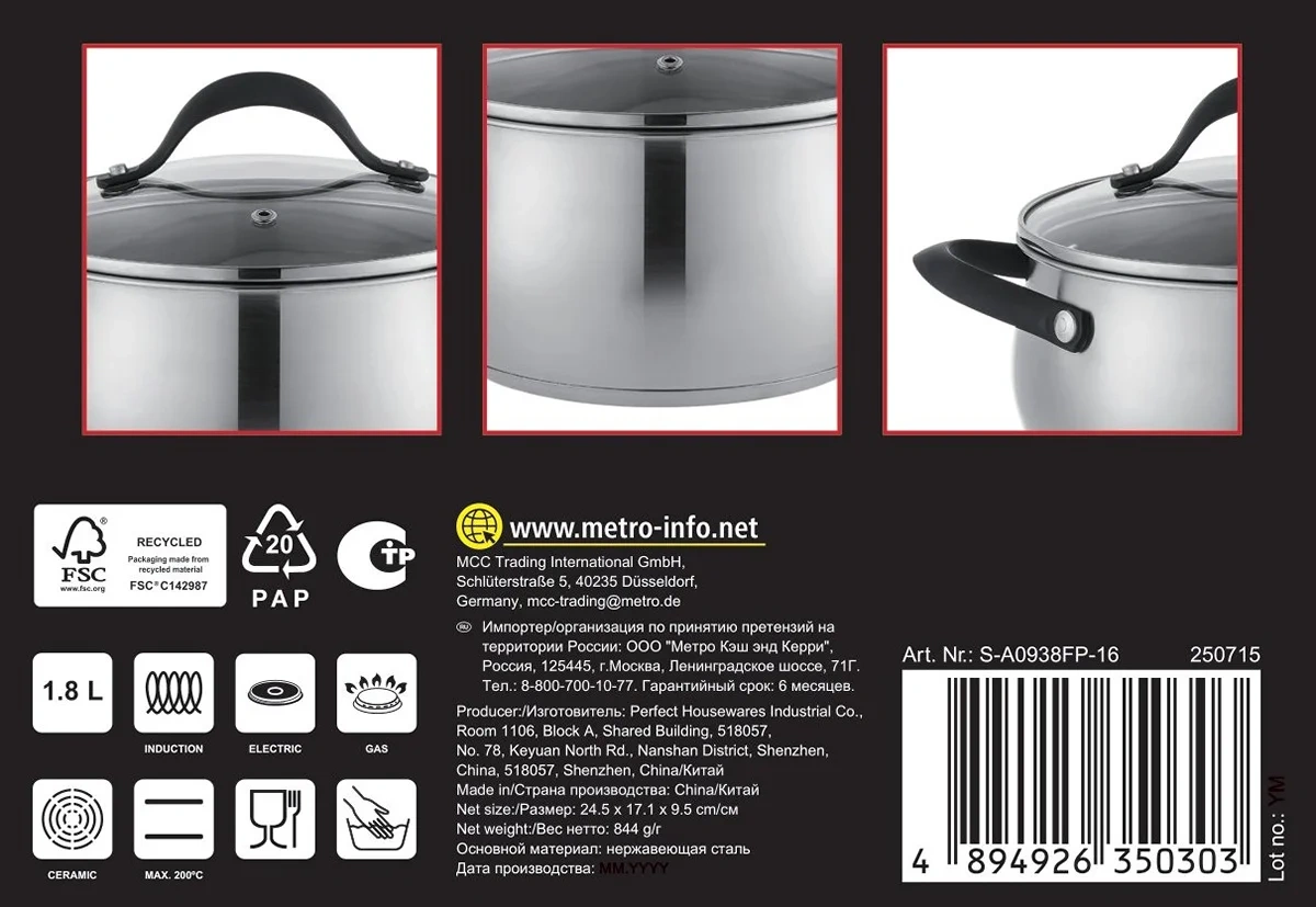 Удобная термостойкая бекалитовая ручка с алюминиевой защитной рамкой обеспечивает комфорт при использовании. Не подходит для использования на индукционных плит, а также не рекомендуется мыть в посудомоечной машине и использовать в духовке.