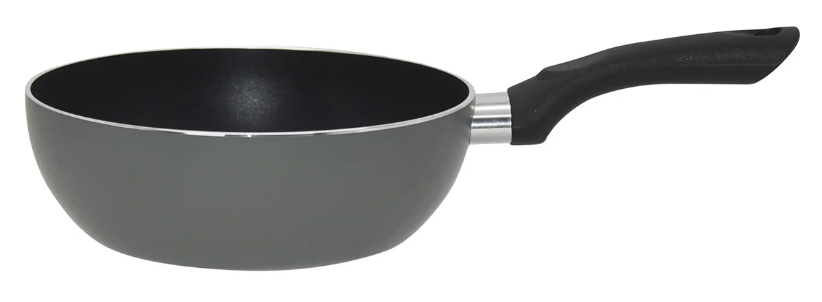 Сковорода Вок из алюминия диаметром 20 см с антипригарным покрытием. Цвет изделия - серый. Толщина стенок составляет 2,5 мм. Оснащена черным антипригарным покрытием из материала Флюон. Дно типа CD, не предназначено для индукционных плит.