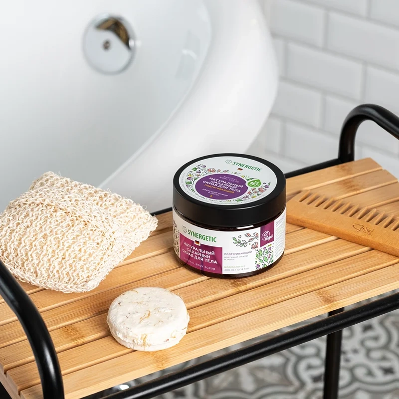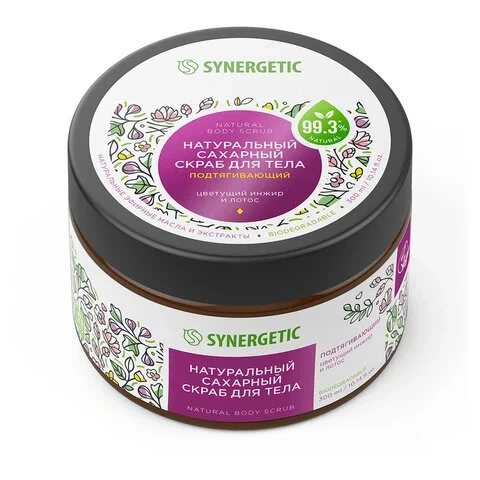 Натуральный сахарный скраб для тела SYNERGETIC подтягивающий 'Цветущий инжир и лотос' – это эффективное средство для ухода за кожей, более чем на 99% состоящее из натуральных компонентов. Скраб деликатно отшелушивает и очищает кожу. Масло кокоса подтягивает кожу и придает упругость, а масло карите интенсивно питает, делая кожу гладкой и бархатистой. Масло миндаля, экстракты инжира и цветков лотоса оказывают регенерирующее действие, питают и увлажняют нежную кожу. Гипоаллергенная парфюмерная композиция разработана в швейцарском доме Givaudan, где уже более ста лет создают ароматы, которые используются во всем мире в парфюмерии и косметике. Парфюмерная композиция натурального скраба для тела с маслами померанца, элеми, эвкалипта, лайма и мирта оставляет на коже изысканный аромат. Средство не содержит SLS, SLES, парабенов, силиконов, минеральных масел и красителей, а также компонентов животного происхождения, не тестируется на животных и сертифицировано британской организацией The Vegan Society. Знак Vegan – мировой стандарт этичной продукции.