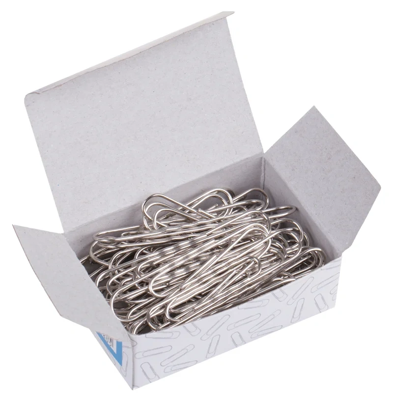 Никелированные гофрированные канцелярские скрепки овальной формы. Отличный инструмент для работы с документами, не пачкают и не деформируют бумагу, не ржавеют, надежно скрепляют документы. Упакованы в картонную коробку по 50 шт. Длина - 50 мм.