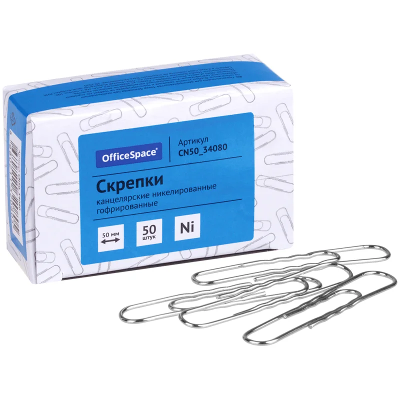Скрепки 50мм, OfficeSpace, 50шт., никелированные, гофрированные, карт. упак.