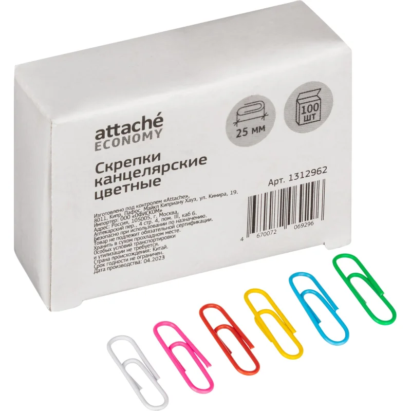 Скрепки Attache Economy с полимерн. покрытием, 25 мм,разноцветные,100 шт/уп