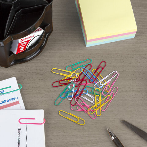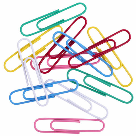 Большие скрепки изготовлены из прочной стали, имеют классическую овальную форму и цветное пластиковое покрытие Длина скрепки составляет 50 мм. Не окисляются и не повреждают документы. 50 штук в картонной коробке.