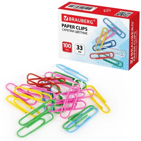 Скрепки BRAUBERG, 33 мм, цветные, 100 шт., в картонной коробке, 270444