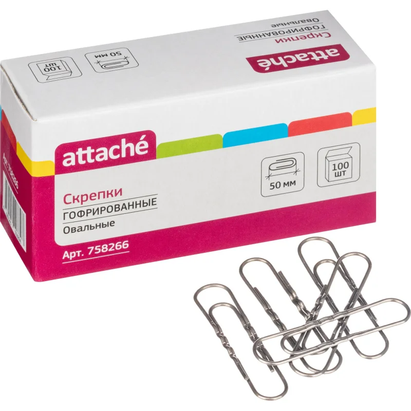Скрепки Attache незаменимы при работе в офисе или дома, когда нужно соединить несколько бумаг, например, все листы договора или другие важные документы. Металлические без покрытия гофрированные. Имеют закругленную форму, что позволяет надежно скреплять документы. Длина 50 мм. В упаковке 50 скрепок. В промежуточной упаковке 40 упаковок по 100 скрепок. Товар с упрощенными характеристиками. Не рекомендован для использования во влажном помещении. В упаковке допустимо наличие мелких древесных элементов, используемых при финишной обработке товара, а также следов вытравки коррозии.