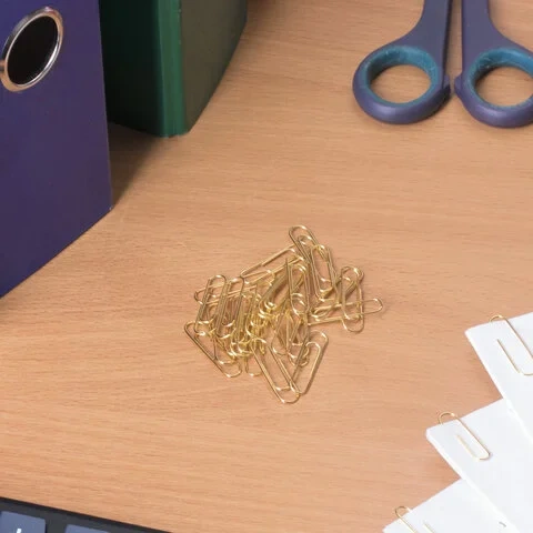 Скрепки изготовлены из стали, имеют классическую овальную форму и золотистый цвет. Длина скрепки составляет 28 мм. Не окисляются и не повреждают документы. 100 штук в картонной коробке.