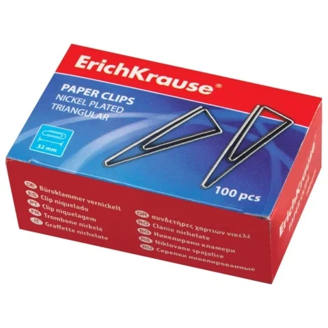 Скрепки канцелярские Erich Krause 32мм, треугольные, никелированные, 100шт/уп, 24870