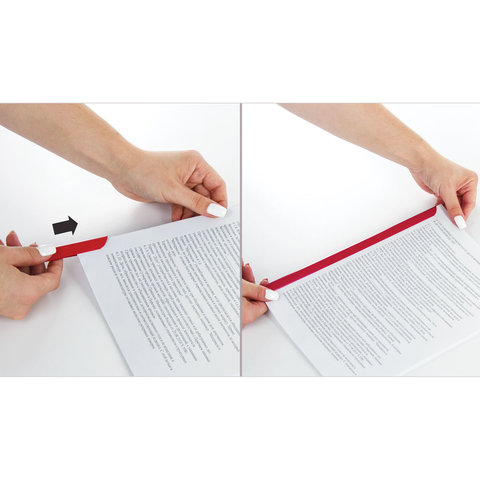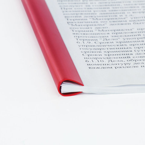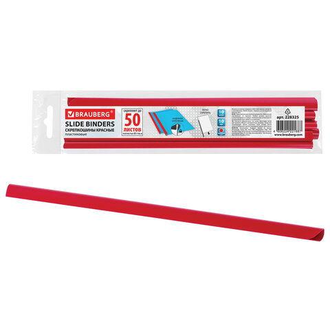 Плотный пластиковый корешок красного цвета надежно скрепляет бумаги. Вмещает до 50 листов. Длина механизма составляет 297 мм, а ширина 10 мм. В комплект входит 10 штук.