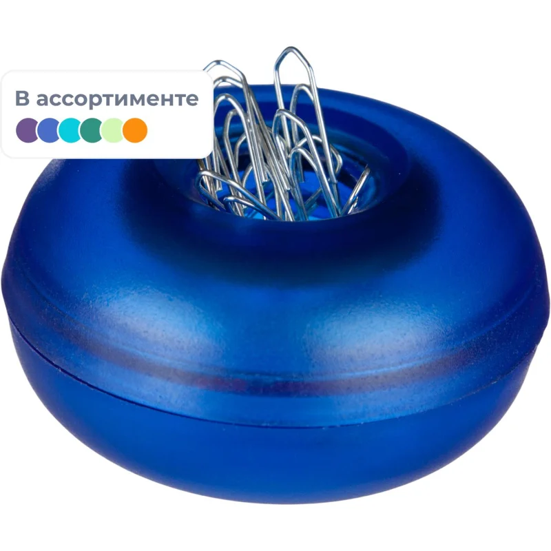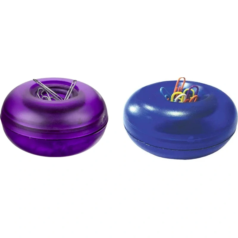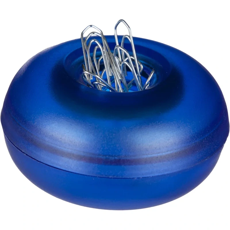 Магнитная скрепочница круглой формы выполнена из полупрозрачного пластика. Открытая конструкция облегчает извлечение скрепок, а встроенный магнит предотвращает их рассыпание. Вместительная и компактная одновременно. Верхняя часть открывается для загрузки. Скрепки в комплект не входят. Размер скрепочницы (ШхВ): 68×40 мм.
