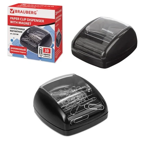 Скрепочница магнитная Brauberg черная, + 30 скрепок, роликовый механизм подачи