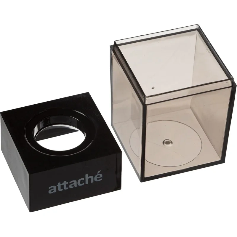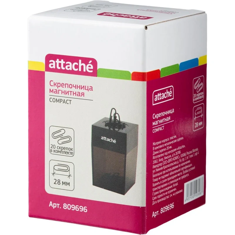 Скрепочница Attache предназначена для удобного хранения скрепок на рабочем столе. Она поможет поддерживать порядок на Вашем рабочем месте, при этом скрепки всегда будут под рукой в нужный момент. Прямоугольный корпус выполнен из полупрозрачного пластика черного цвета с черной крышкой. Размер скрепочницы (ШхВ): 43×69 мм. Диаметр отверстия в верхней части — 22 мм. Загрузка скрепок производится сверху. Имеется встроенный магнит, который предотвращает произвольное высыпание скрепок. В комплекте поставки 20 металлических скрепок 28 мм.