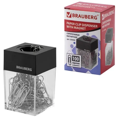 Скрепочница магнитная BRAUBERG, 100 никелированных скрепок 28 мм, прозрачный корпус, черная крышка,