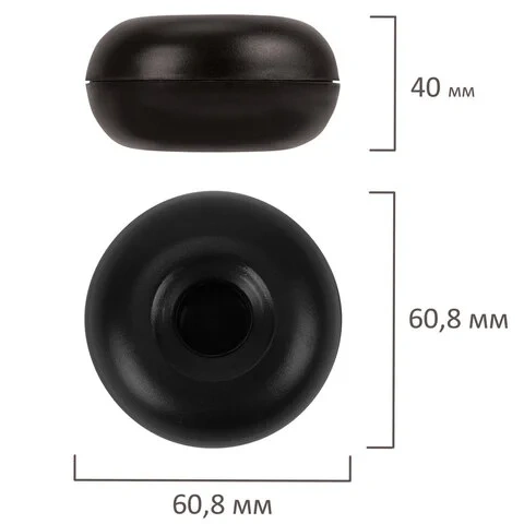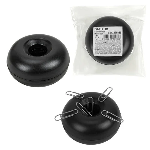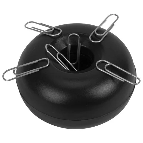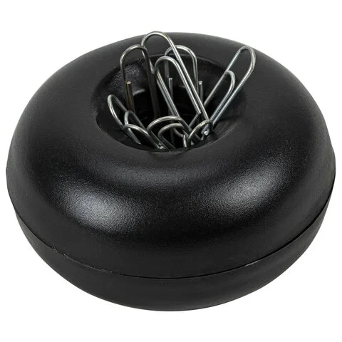 Скрепочница округлой формы выполнена из прозрачного пластика. Встроенный магнит предотвращает высыпание скрепок. Размер - 4x6х6 см.