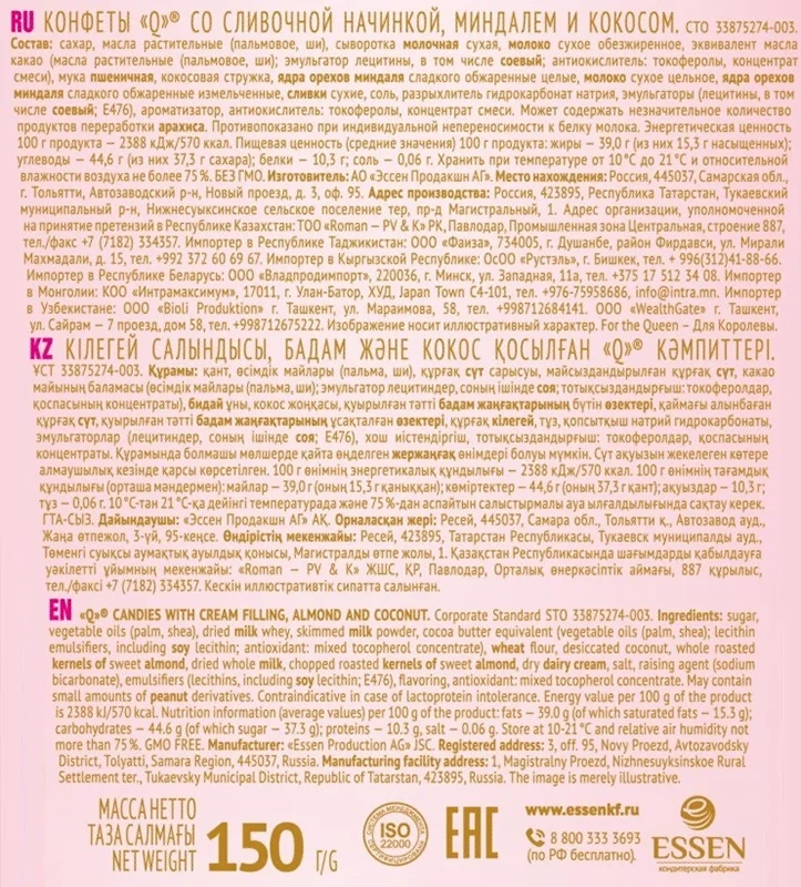 Конфеты Essen сливочная начинка с миндалем и кокосом, 150г