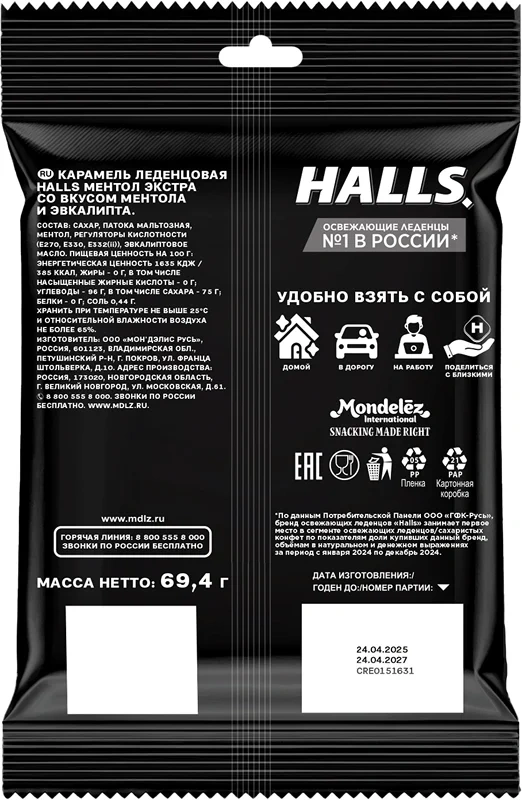 Леденцы Halls Ментол экстра, 69.4г