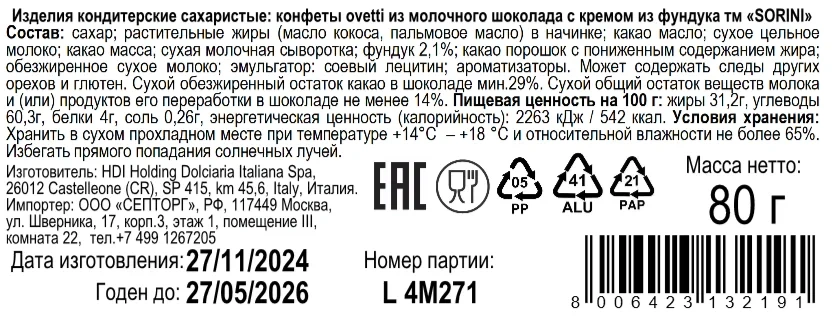 Конфеты Sorini в молочном шоколаде с кремом из фундука, 80г