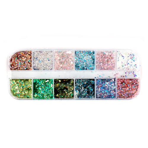Блестки разных оттенков, расположенные в удобном боксе на 12 делений.