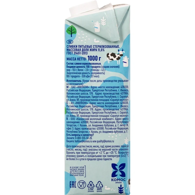 Сливки Стерил 11% 1кг МолочнаяРечка
