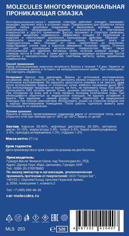 Универсальное средство с широким спектром действия: очищает, смывает, защищает, вытесняет влагу и устраняет скрип. Предназначено для обработки петель дверей, любых резьбовых соединений и механизмов, крепежа, замков электрического оборудования, трущихся металлических и пластиковых поверхностей и другого применения. Быстро проникает в структуру ржавчины, возвращая механизму подвижность. Эффективно очищает от загрязнений и коррозий и обеспечивает длительное смазывающее действие. Образует на поверхности защитную антикоррозийную плёнку.