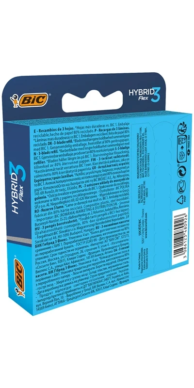 Ощутите сверхгладкое бритьё с мужской бритвенной системой Bic Hybrid 3 Flex. Технология 3 подвижных нанотехнологичных лезвий, индивидуально подстраивающихся под контуры вашего лица, обеспечивает тщательное и чистое бритьё. Увлажняющая полоска улучшает скольжение. Упаковка, сделанная из перерабатываемого картона, содержит 4 сменные кассеты.