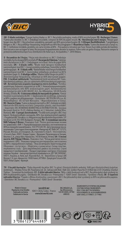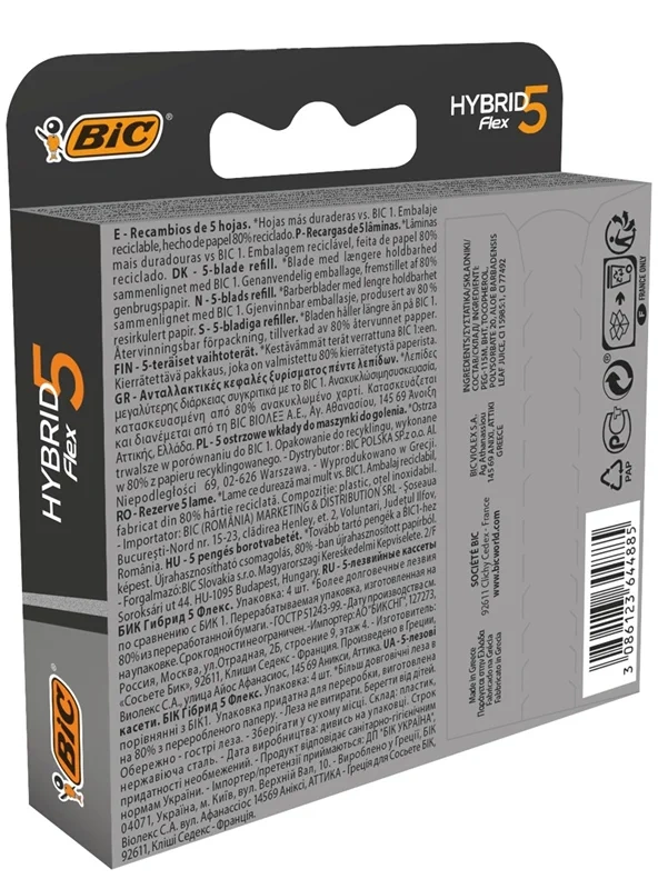 Hybrid 5 Flex - лучшее бритьё от Bic. 5 нанотехнологичных подвижных лезвий индивидуально подстраиваются под контуры вашего лица, обеспечивая сверхтщательное и гладкое бритьё, а дополнительное лезвие-триммер позволяет добиться высокой точности даже в труднодоступных зонах. В комплекте 4 сменные кассеты. Теперь в новой перерабатываемой упаковке!