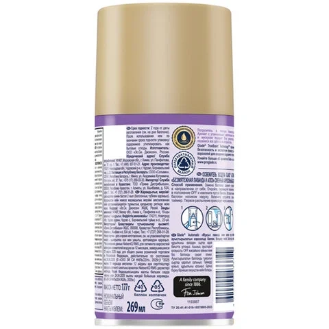Назначение: погрузись в полную безмятежность. Созданный с заботой о природе, с умиротворяющими нотами прованской лаванды, алоэ и лепестков нежной фиалки, этот аромат поможет расслабиться и отдохнуть. Универсальный Баллон сменный, подходит к любым автоматическим освежителям воздуха. «True Scent Technology» гарантирует безопасность и экспертную формулу своих аэрозолей для создания ощущения чистоты. Парфюмерные композиции с эфирными маслами. Аромат 24/7, до 2400 распылений. Способ применения: замена баллона — держите устройство в направлении «от себя». Откройте, переведите переключатель в положение «off» и извлеките пустой баллон. Вставьте Баллон сменный носиком наружу. Включите устройство, установив таймер. Первое распыление произойдет через несколько секунд.