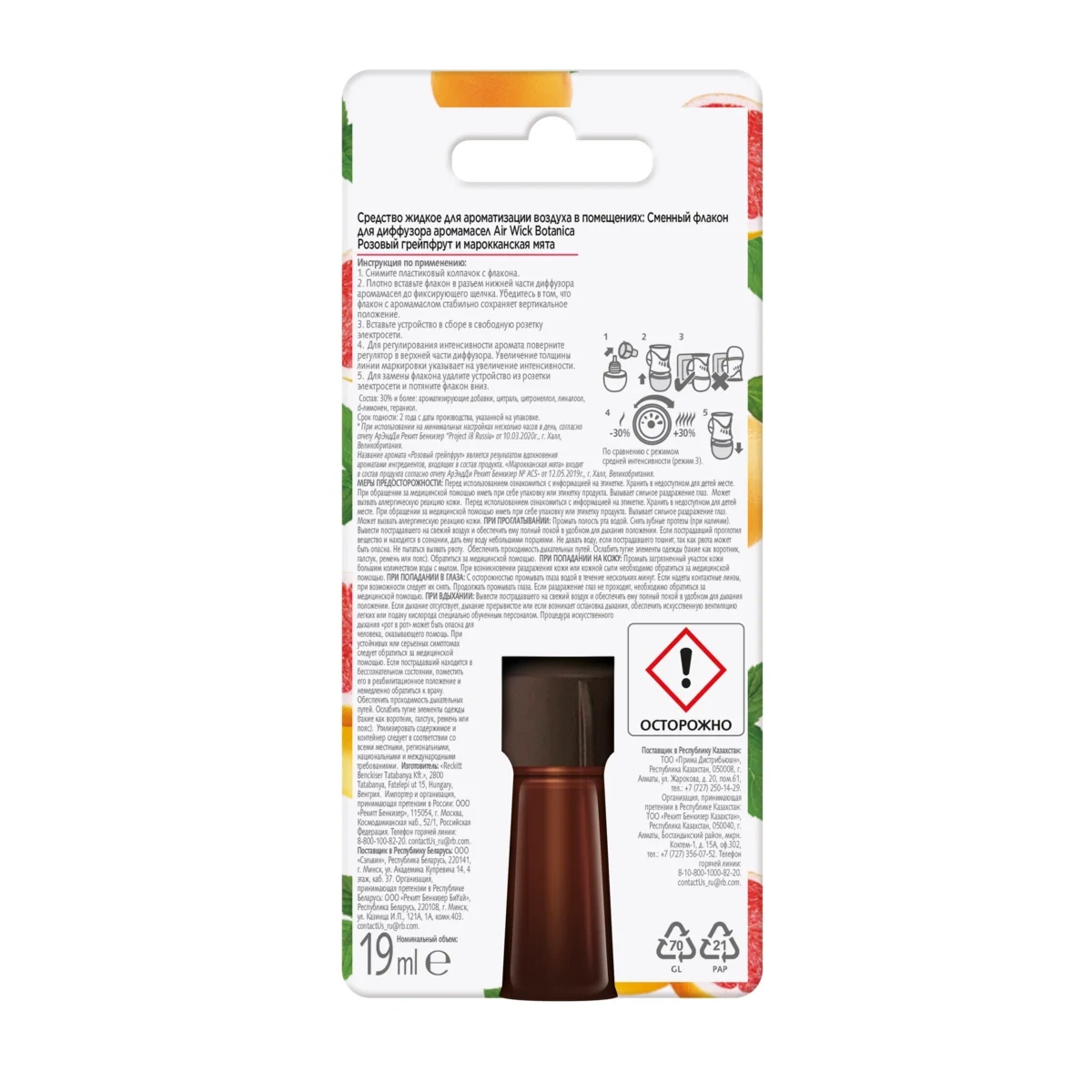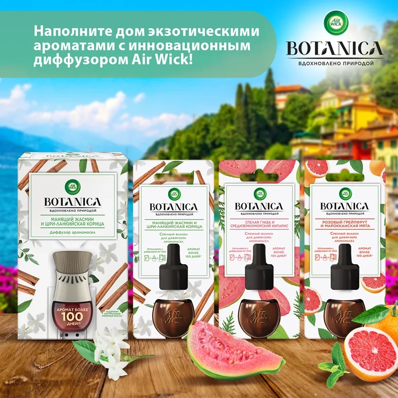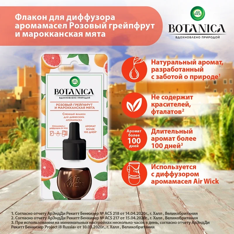 Ароматы Botanica изготовлены из натуральных ингредиентов, тщательно собранных с заботой об окружающей среде.* Современный диффузор Air Wick Botanica наполнит дом длительным ароматом** бодрящего розового грейпфрута в сочетании со свежими нотками марокканской мяты.*Cогласно отчету АрЭндДи Рекитт Бенкизер № ACS-218 от 14.04.2020г., г. Халл, Великобритания**При использовании на минимальных настройках несколько часов в день, согласно отчету АрЭндДи Рекитт Бенкизер “Project i8 Russia от 10.03.2020г., г. Халл, Великобритания
