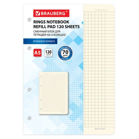 Сменный блок для тетрадей на 4 кольцах А5 120 л., BRAUBERG, ПОВЫШЕННОЙ ПЛОТНОСТИ, кремовый, 403639