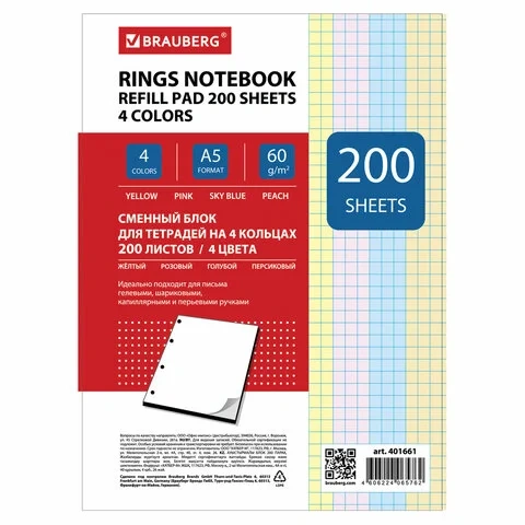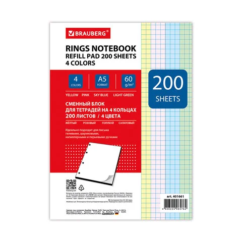 Сменный блок для тетради на кольцах Brauberg 4 цвета, A5, 200 листов, в клетку