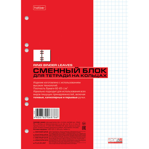 Сменный блок для тетради на кольцах Hatber белый, А5, 120 листов, в клетку