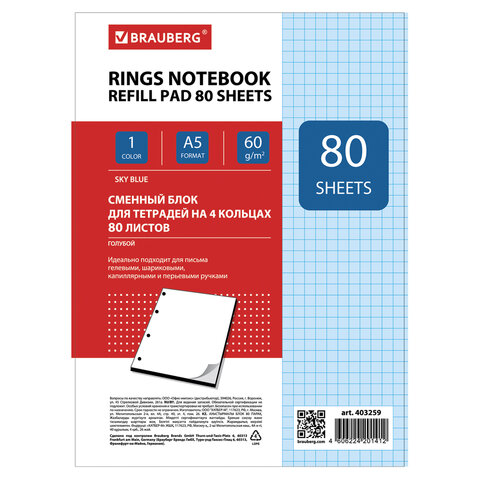 Подходит для всех тетрадей на кольцах формата А5. Внутренний блок содержит 80 листов офсетной бумаги плотностью 60 г/м2. голубого цвета. Линовка - в клетку без полей. Упакован в термопленку.