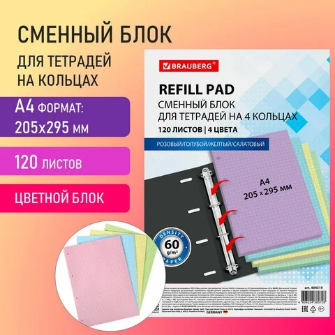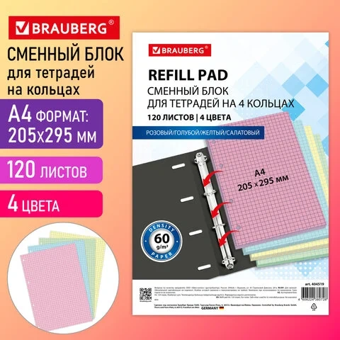 Сменный блок для тетради на кольцах Brauberg А4, 120 листов, 4 цвета по 30 листов