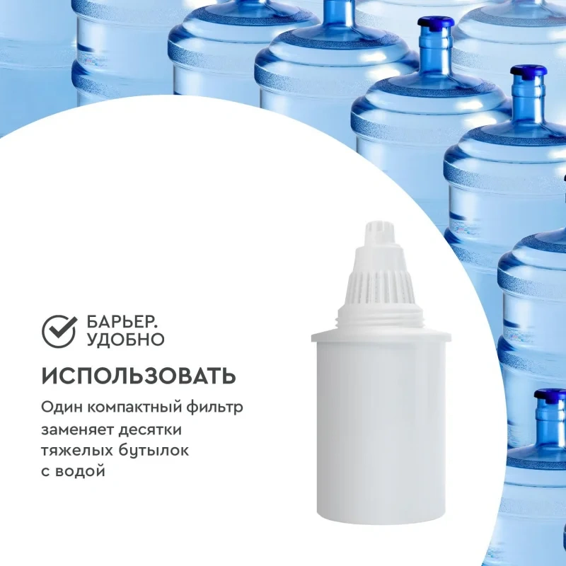 В упаковке находится 3 кассеты Барьер Стандарт, все кассеты Барьер подходят ко всем кувшинам Барьер. Одна кассета Барьер способна заменить несколько сотен пластиковых бутылок.
