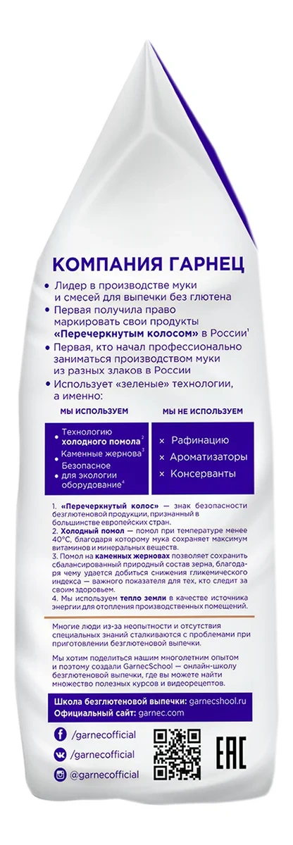 Кокосовая стружка, входящая в состав смеси, придает готовой выпечке приятный кокосовый аромат и нежный сливочный вкус. Смесь создана на основе муки жернового помола, при котором сохраняется сбалансированный природный состав зерна. Данный продукт не содержит глютен. Отсутствие глютена проверяется на каждом этапе производства. Продукт предназначен для всей семьи.