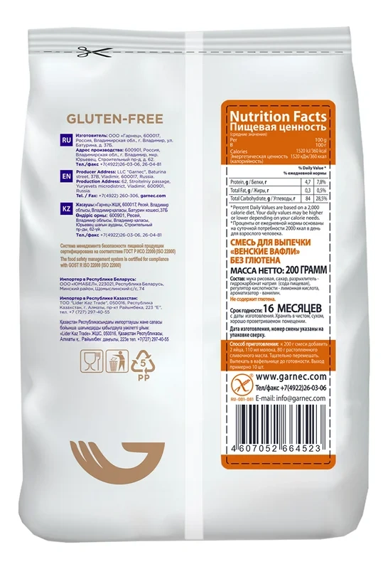 Прекрасно подойдут в качестве перекуса в школе, на пикнике или в дороге. Готовые вафли можно подавать с ягодами, фруктами, джемом, шоколадом и топингами. Смесь создана на основе муки жернового помола, при котором сохраняется сбалансированный природный состав зерна, а это значит, что ваша выпечка будет не только вкусной, но и полезной. Данный продукт не содержит глютен. Отсутствие глютена проверяется на каждом этапе производства.