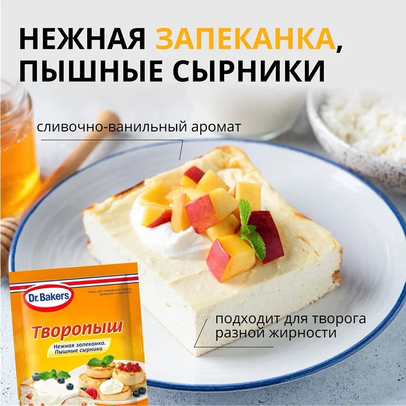 Незаменимый помощник для всех, кто хочет приготовить воздушную запеканку или пышный пирог из творога. Для того, чтобы готовые изделия получились нежными, объемными и аппетитными, рекомендуется строго следовать инструкции, представленной на упаковке смеси. Изумительные творожные десерты, приготовленные в домашних условиях, станут прекрасным угощением для ваших близких и друзей. Dr.Bakers предлагает продукты, которые сделают процесс создания тортов, кексов, пирогов и запеканок легким, а получившуюся выпечку – гарантированно удачной.