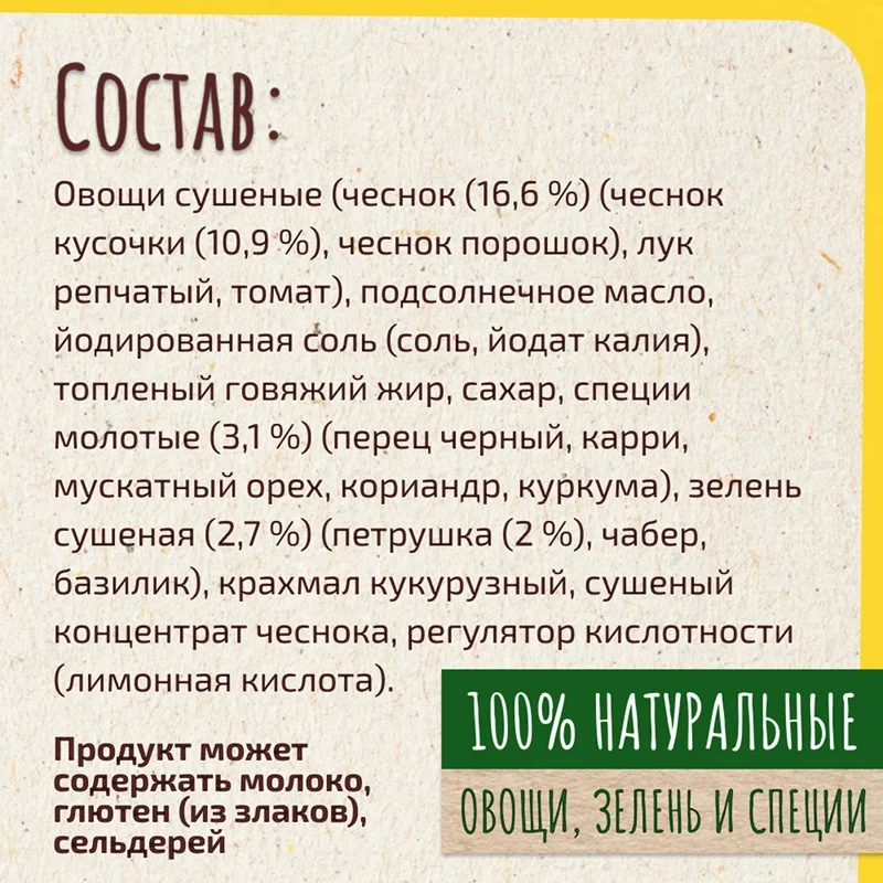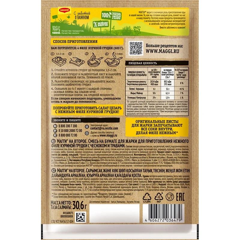 Листы для жарки Maggi На второе с готовой смесью для рецепта — это уникальный способ быстрого приготовления сочного куриного филе с чесноком и травами. Больше не нужно изучать сложные рецепты и тратить ценное время, стоя за плитой. С Maggi вы легко сделаете ресторанное блюдо дома всего за 14 минут! Листы со слоем приправ и специй запечатывают внутри мяса все соки и делают его более нежным. В состав смеси входят сушеные овощи, среди которых отборный чеснок, лук и томаты, а также букет пряностей и душистых трав — петрушка, кориандр, чабер, базилик, карри, мускатный орех, соль и перец. Такой набор делает курочку невероятно вкусной и придает ей аппетитный аромат.