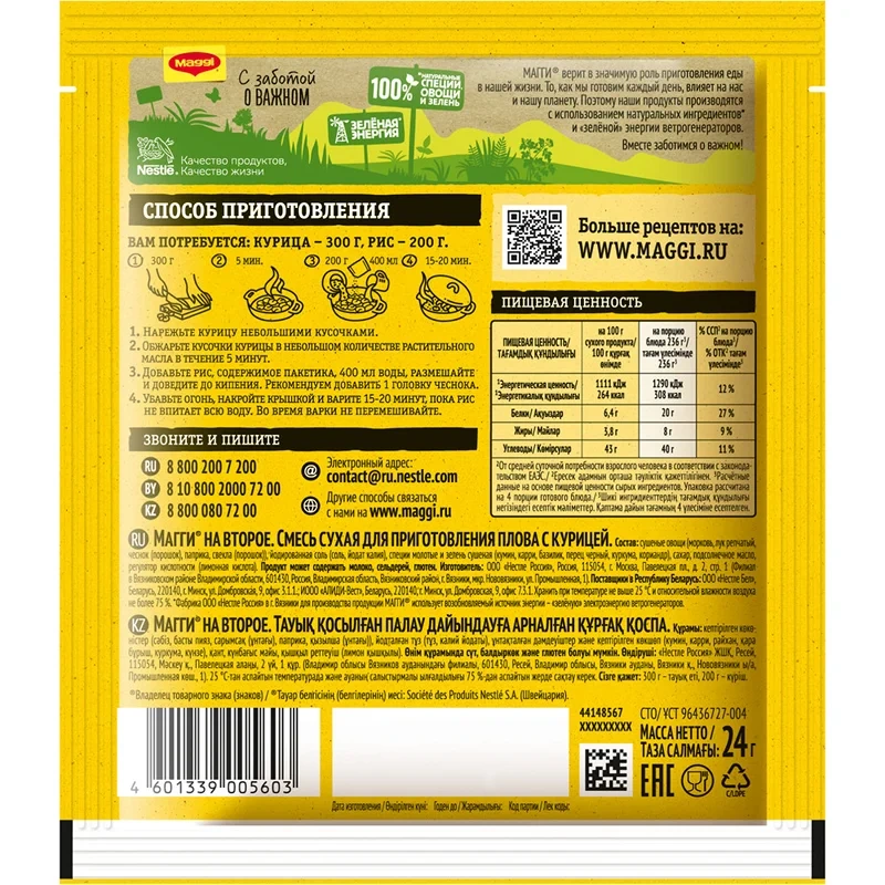 Плов — невероятно вкусное блюдо народов Средней Азии, Закавказья, Ближнего и Среднего Востока. С Maggi На второе вы сможете приготовить идеальный плов с курицей прямо у себя дома без лишних усилий. В состав сухой смеси входят натуральные овощи, среди которых морковь, лук, чеснок, паприка и свекла, а также букет пряных специй — кумин, карри, куркума, перец и кориандр. Такой набор помогает легко сделать гарантированно вкусное блюдо на всю семью.