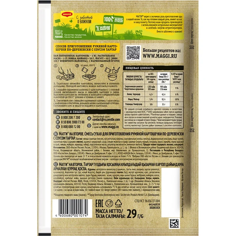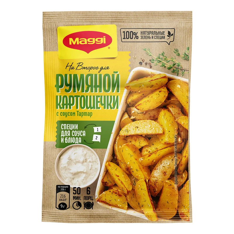 Порадуйте ваших близких незабываемым вкусом любимой картошечки! В двойном пакете Maggi для румяной картошечки вы найдете готовую смесь для приготовления золотистого слегка поджаренного картофеля, а также смесь для нежного сливочного соуса тартар. Душистый рубленный чесночок, яркие специи и пряные травы придадут блюду изысканный аромат и неповторимый вкус. Maggi - с заботой о важном. Только знакомые ингредиенты.