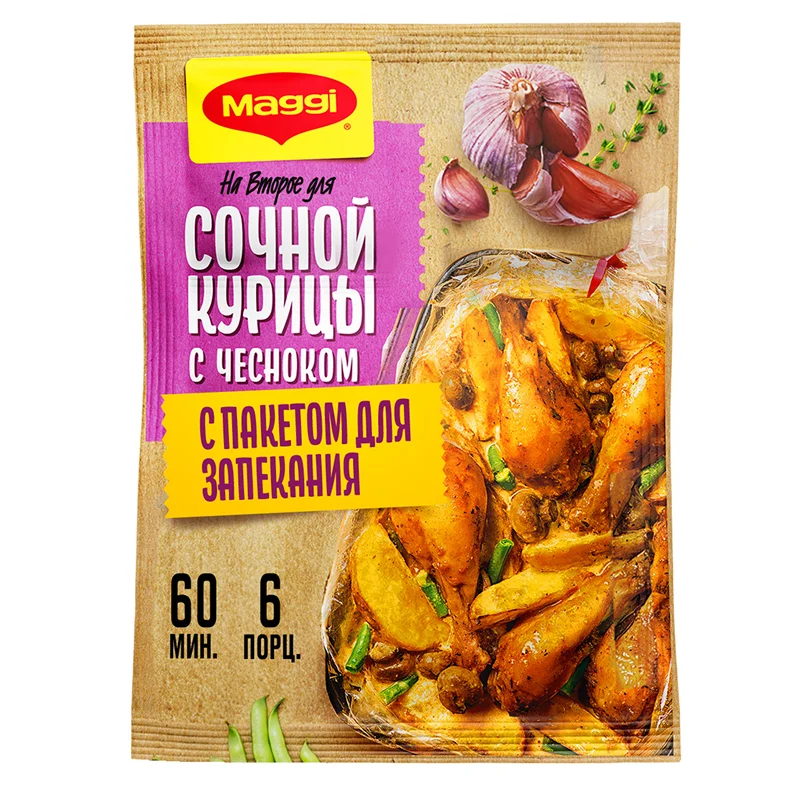 Как приготовить сочную курочку с чесноком на всю семью без лишних хлопот? С Maggi На второе вы легко приготовите мясо с гарниром и соусом за 50 минут, даже не стоя у плиты. Смесь натуральных овощей — чеснок, лук, паприка, томат и картофельные хлопья, а также букет душистых трав и специй раскрывают вкус мяса и придают ему аппетитный аромат. Вам не нужно добавлять масло и следить, чтобы ничего не пригорело. Новый вариант приготовления сочной курицы с овощами и соусом.