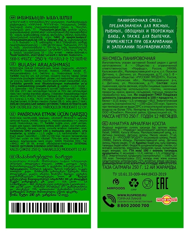 Альтернатива панировочным сухарям. Предназначена для мясных, рыбных, овощных и творожных блюд, а также для выпечки. Применяется при обжаривании и запекании полуфабрикатов. Специально подобранная композиция пряностей, содержащихся в панировке, придает блюдам неповторимый вкус и аромат. Мясо в панировке сохраняет свою сочность, а его приготовление становится простым и быстрым.
