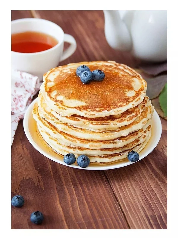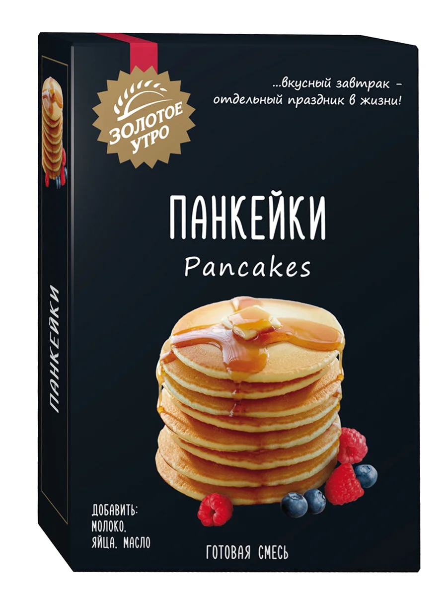 Панкейки – популярное блюдо Северной Америки. За океаном их чаще всего едят на завтрак, но также готовят, когда хотят быстро и сытно перекусить. В отличие от наших блинов, панкейки больше похожи на бисквитные оладьи. Благодаря готовой смеси для выпечки Панкейки торговой марки Золотое утро вы сможете с лёгкостью приготовить этот североамериканский десерт. Одной упаковки готовой смеси достаточно, чтобы приготовить порядка 15 панкейков диаметром 12-13 сантиметров. Готовые панкейки можно украсить ягодами или порезанными фруктами, подавайте их со сливочным маслом и/или сиропом для блинов и оладий Золотое утро.