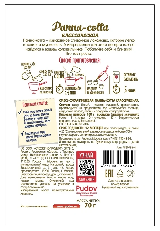 Специально для тех, кто любит легкие, нежные и воздушные десерты с роскошной текстурой, С. Пудовъ предлагает готовую смесь Классическая панна-котта, из которой вы без лишних усилий сможете приготовить традиционный итальянский десерт. Он одновременно прост и потрясающе вкусен, но при этом не требует экзотических или дорогих ингредиентов.