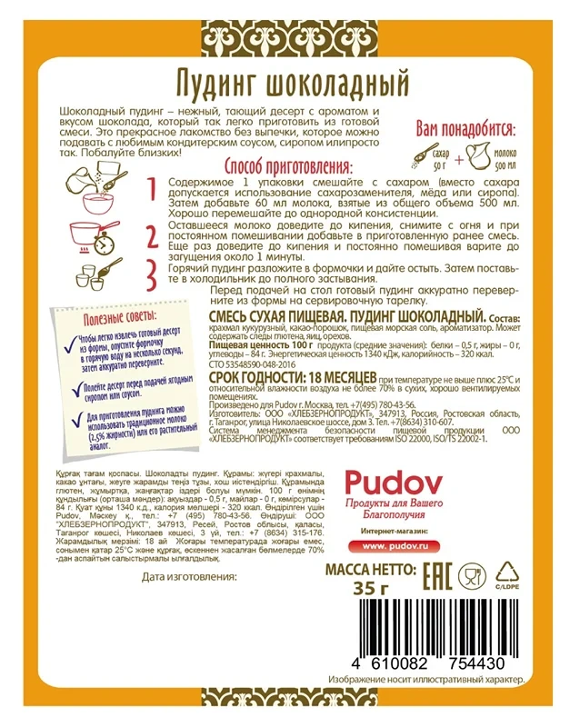 Готовая смесь для приготовления вкусного шоколадного пудинга С. Пудовъ позволит вам легко и максимально быстро порадовать себя и близких великолепным нежным десертом. Чтобы приготовить пудинг, вам больше не нужно подбирать ингредиенты, следовать сложным расчётам в рецептах из непроверенных источников и переживать за готовый результат. С готовой смесью для приготовления шоколадного пудинга С. Пудовъ у вас обязательно всё получится: рецепт разработан профессиональными технологами компании, мы рассчитали все пропорции и предлагаем простой рецепт. Просто возьмите пакетик готовой смеси, добавьте молоко и сахар и следуйте простым рекомендациям на упаковке. Готовая смесь для приготовления шоколадного пудинга С. Пудовъ разработана таким образом, чтобы рецепт можно было легко адаптировать для создания диетической версии десерта. Просто замените сахар на любимый вами сахарозаменитель, используйте вместо традиционного молока его растительный аналог и наслаждайтесь вкусным ПП-лакомством. Перед подачей украсьте готовой пудинг свежими ягодами или кусочками фруктов, взбитыми сливками или любимым сиропом.