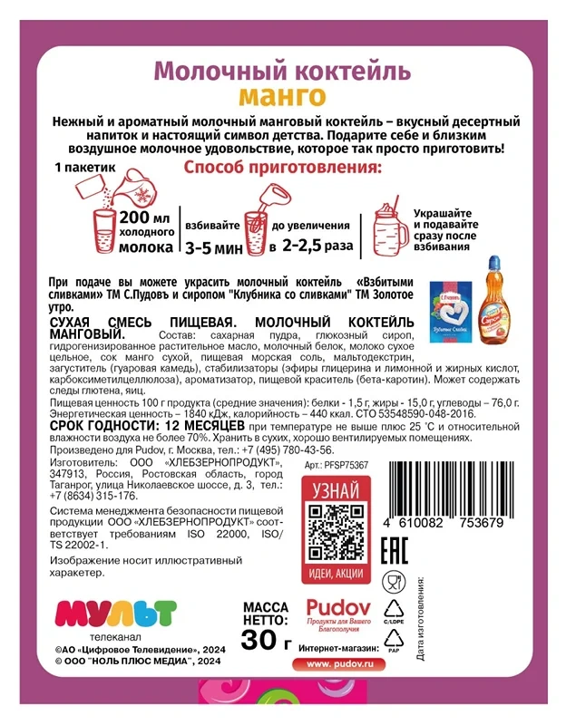 Настоящий символ детства - воздушный молочный коктейль с ярким вкусом манго. Побаловать себя и ребятишек этим вкусным напитком можно с помощью готовой смеси С. Пудовъ, а весёлое настроение и детский задор поддержат герои популярного анимационного сериала Сказочный патруль. Готовая смесь для приготовления молочного мангового коктейля позволит вам за считанные минуты приготовить вкусный десертный напиток у себя дома. Всё, что вам понадобится для этого – 200 миллилитров молока. Смесь легко взбивается кухонным миксером, а готовый коктейль получается воздушным и очень вкусным - таким, как в детстве. Манговый молочный коктейль прекрасно насыщает, утоляет жажду и просто дарит наслаждение и детям, и взрослым. Подавайте его на десерт или в качестве освежающего летнего перекуса. Перед подачей молочный коктейль можно украсить взбитыми сливками и/или сиропом.